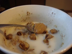 In today’s bowl: 1/3 cup gluten free oats, 1/2 smashed naner, 1 tbsp. ground flax, lots of cinnamon, 2/3 cup water, splash of almond milk, 1 chopped FIG, pb spoon