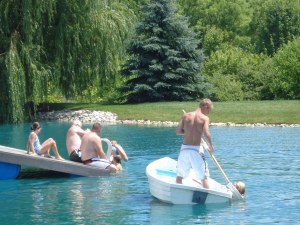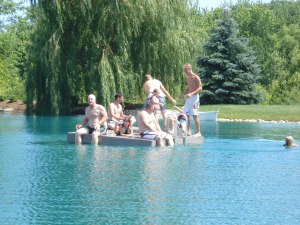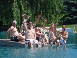 I am not a “pond” girl - in fact, I was in it for a while floating in a tube and a fish came up and nipped my butt! To which everyone told me I needed to “keep moving”. The pond is so much fun - they have a pier, a little row boat (which FH’s cousin Bret manages to sink… a lot), and a floating dock in the middle. The floating dock isn’t very stable, so it makes for a fun time throwing people off