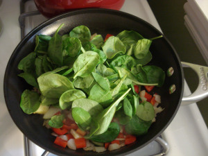 - While that is brewing up a storm, chop up your veggies and sautee them with cooking spray or EVOO in a saute pan.