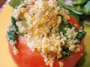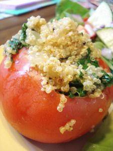 - Spoon quinoa mixture into hollowed out tomatoes.
