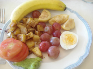 | tomatos and guac, potatoes, fruit, hard boiled egg (yuck - it was gross), and an unpictured justin’s peanut butter packet |