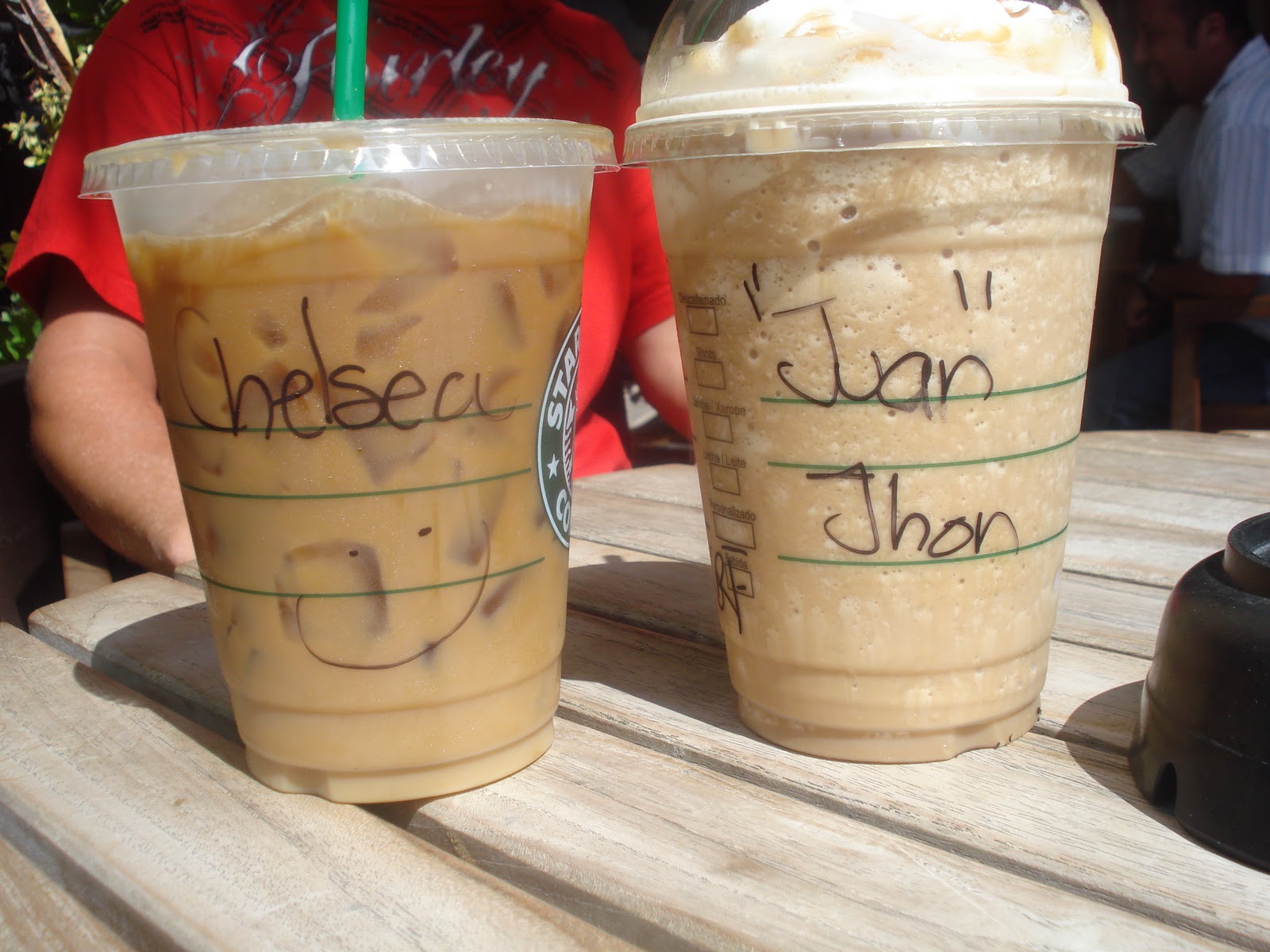| iced coffee for her, caramel frap for him |