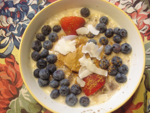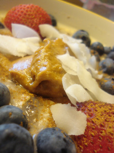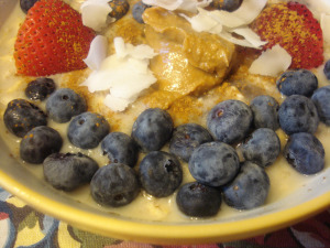 | topped with blueberries, strawberries, cinnamon, peanut butter, and coconut |