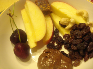 | 1/2 organic pink lady, cherries, raisins, cashews, chocolate almond butter, and a tiny sliver of a pb&j larabar |