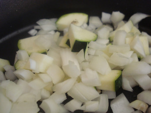 Dump the onion, garlic, and zucchini into the dutch oven and cook until tender and translucent.