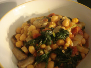 I wasn’t feeling spaghetti tonight. I don’t know why, but I just didn’t want it. The husband is more than happy to indulge in brown rice pasta with me, but I let him enjoy his wheat laden pasta tonight for once. I got to work on a concoction inspired by Angela’s Speed it Up Spinach and Chickpeas.