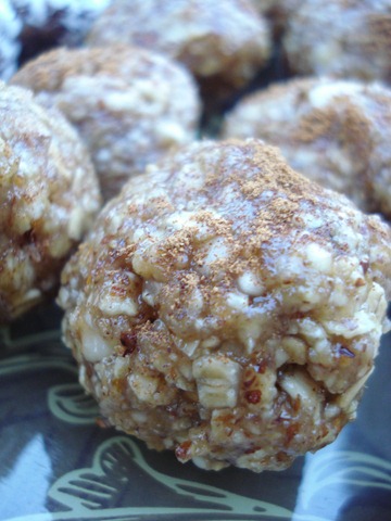 Mix all ingredients in a large bowl. Put some mixture aside if you want to make the chocolate and/or pumpkin variety. Form into small balls and place on a cookie sheet lined with wax paper. Place in the freezer for 10-15 minutes to set.