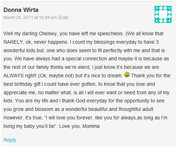 Many of you commented yesterday on my post to my mom about how you hoped she read it. You also wanted to know her reaction to the post. Last night when we surprised her when she came home from a business trip, she came into the house with tears pouring down her face and she instantly embraced me. Okay, not really. But she loved it — she thought it was beautiful. And here is her comment: