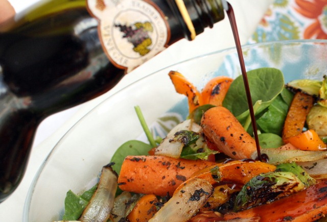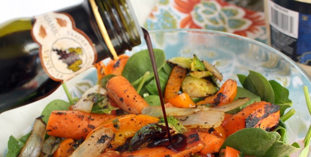 Top your spinach with the grilled vegetables, and pour a splash of balsamic over the salad.
