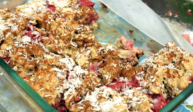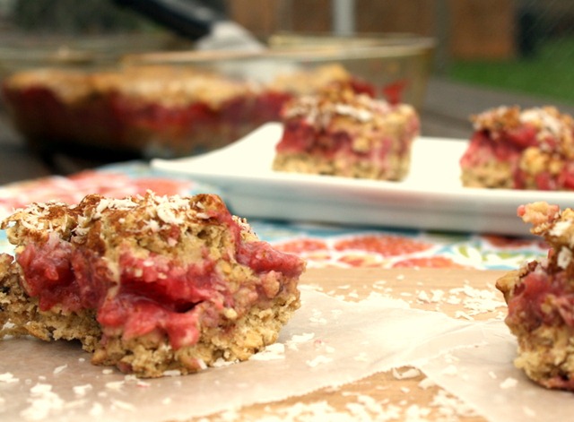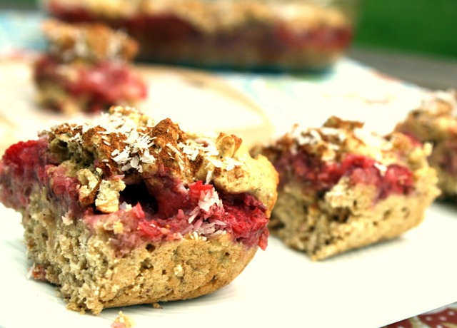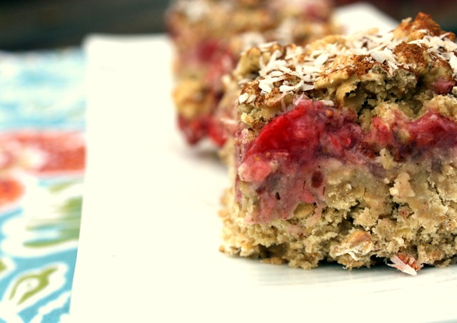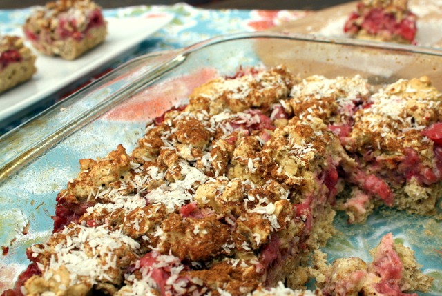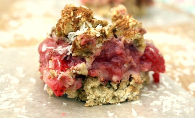 To assemble the bars, first spray an 8×8 pan with cooking spray (or coat with coconut oil — yum!). Spread half of the batter evenly on the bottom of the pan and top with the strawberry filling. Gently drop spoonfuls of the remaining batter on top of the filling. Lastly, sprinkle the bars with coconut and cinnamon and bake in a 350 degree oven for 25 minutes.