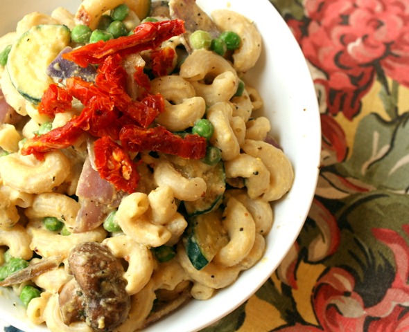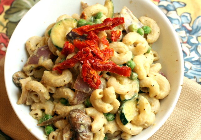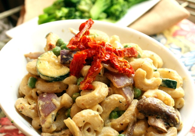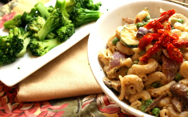 Directions: Begin by bringing water to a boil in a medium sized saucepan for the elbow pasta. While waiting for the water to boil, cut up your vegetables and place in a large stir fry pan (with the exception of the sundried tomatoes) with 1 tbsp. olive oil. Heat on medium high heat, stirring frequently for ~5 minutes. Add spices, lower heat, and cover. Continue heating until vegetables are tender. When the water comes to a boil, add your pasta and cook per the directions on the package. While the pasta is cooking, whip up your batch of cream sauce. Once the pasta is tender, drain the pasta, add your vegetables and cream sauce — stir to coat and add sun dried tomatoes on top.