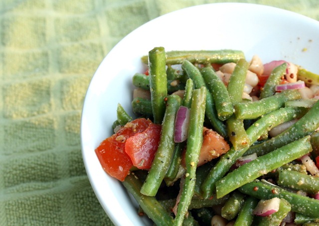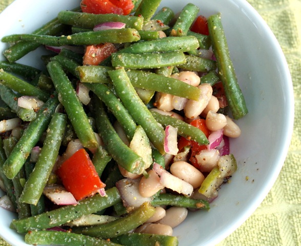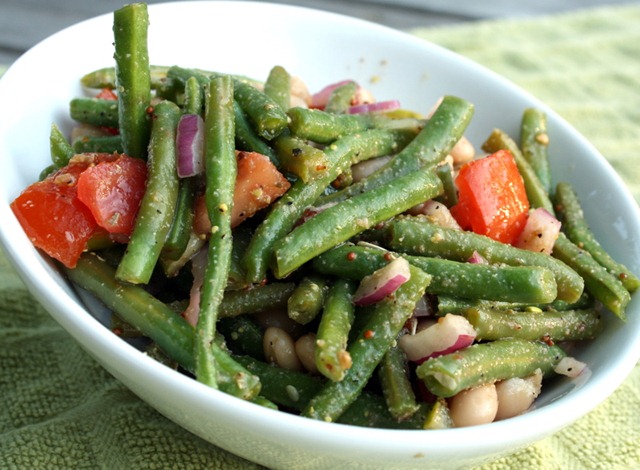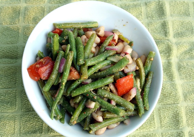Directions: Trim and halve your green beans and place in a large bowl with 2-3 inches of water. Steam in the microwave for 3-4 minutes and immediately transfer into a bowl of ice water to stop the cooking process. Dry your green beans off and combine with the white beans, tomato, onion, and cucumber. Add the ingredients for the marinade and toss to coat evenly. Refrigerate for 2-3 hours or until ready to to be served!