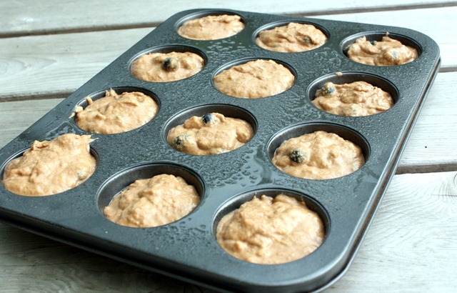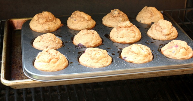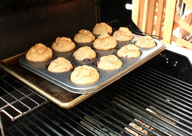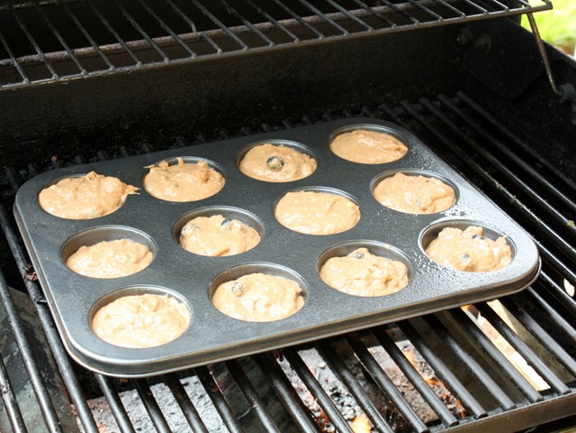 Next, spray a muffin tin with cooking spray. You will want to have preheated your grill for about five minutes — set the burners to low. Place the muffin tin pan on a cookie sheet (to avoid burning) and place them on the lowest burner. Cook for 15-18 minutes. The muffins are done when a toothpick (or a fork) comes out clean.