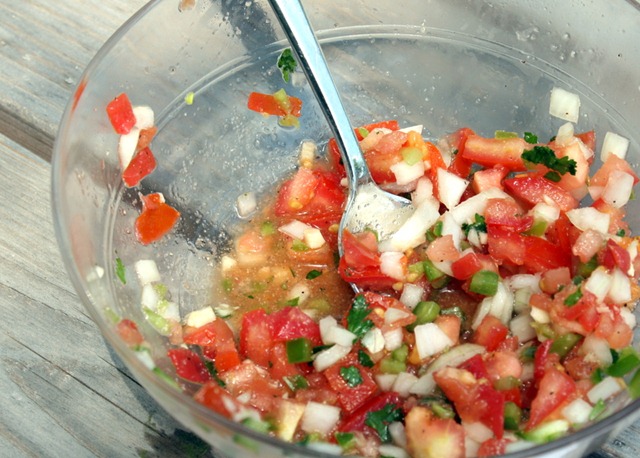 And start dicing away. Believe me — it doesn’t have to be perfect. It doesn’t have to look pretty. It will all taste the same. You’ll want all that juice from your tomatoes to make up the liquid in your salsa.