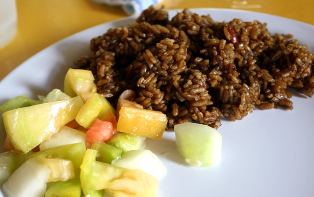 One day when we were on an excursion (which I will talk about in a later post), I got nervous I might not be able to eat anything and brought some fruit and a variety of granola bars. I was pleasantly surprised that the lunch which was provided (set up family style) — I was able to eat a cucumber and tomato salad along with rice and beans.