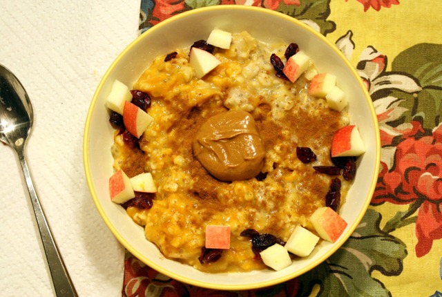 Snack time featured a pumpkin protein muffin (recipe to come, I swear!), half of a microwaved cinnamon apple, a dollop of peanut butter, and some raisins.