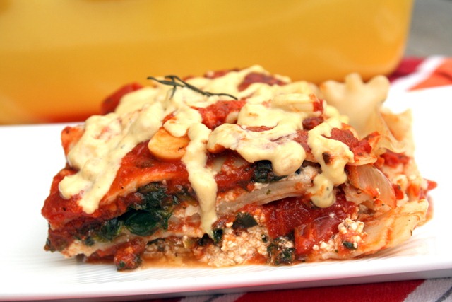 Once your lasagna noodles are finished cooking, drain and place in a single layer on paper towels to dry. Then, begin to assemble your lasagna — put a thin layer of sauce on the bottom of a 9×9 pan and put 3 noodles on top. Add half of your tofu mixture, half of your spinach, and another layer of sauce. Cover with 3 more lasagna noodles, the other half of the tofu, the remaining spinach, and another layer of sauce. Cover with 3 more noodles and another layer of sauce. Loosely cover with foil and bake in a 350 degree oven for 30-35 minutes, uncovering for the last 10 minutes. Once done cooking, let the lasagna sit for 5 minutes before serving.