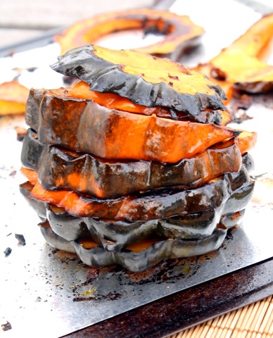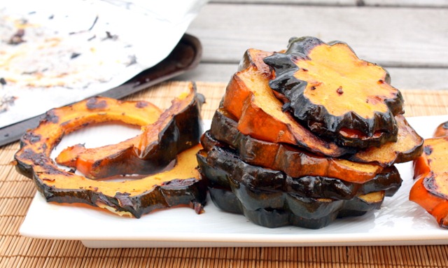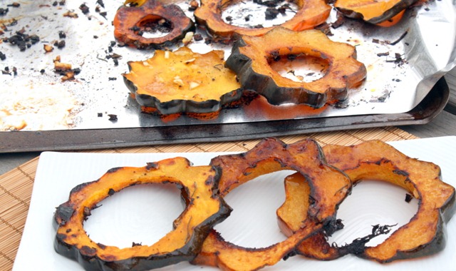 - Using a sharp knife, carefully slice acorn squash width wise (starting with the stem) into 1/4-1/2 inch thick slices.