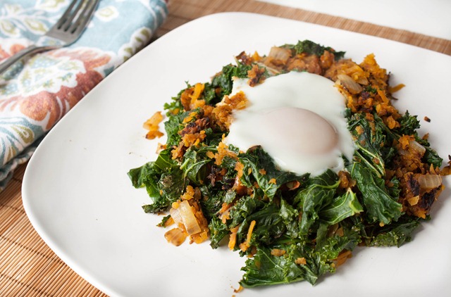 - Crack an egg over the top of the kale and butternut squash and lower the skillet heat to medium low. Cover the skillet and steam cook the egg until the whites have cooked.