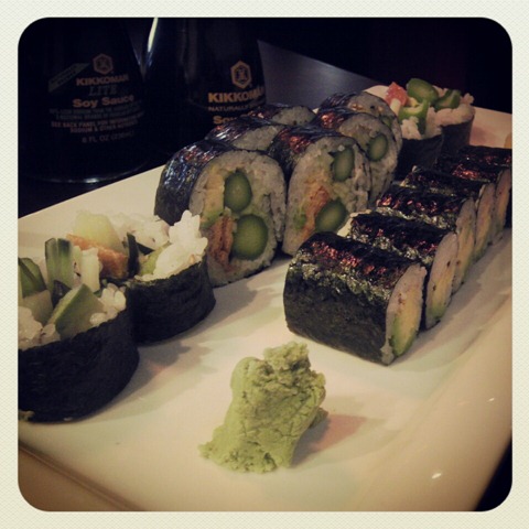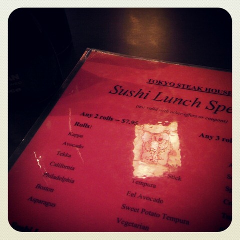 After the store, I headed to meet Katie for one of my favorite meals — sushi! Katie was an awesome friend and drove all the way to the suburbs to hang out with me after her 10 mile race in the rain and wind on Saturday. I was happy to see that the restaurant we went to had lunch specials — 3 rolls for $10.95!