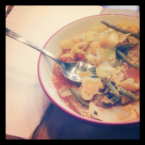 After Katie and I parted ways, I went to Trader Joe’s to pick up the rest of my groceries for the week and went home and made some dinner for the Husband and me. It was a cold and rainy day on Saturday (like 45 degrees — yuck!), so I thought that a last pot of soup for the cold months was a good idea. I made a huge pot of loaded cabbage soup for the two of us!