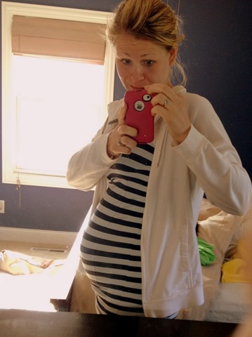 The only shirt I think is going to continue to fit until I deliver is that blue striped one in the above photo…. and it’s not even a maternity shirt – just really stretchy!