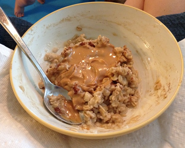 When I got home, the girls gave me the gift of being quiet until 6:00 AM. Woohoo! Then we got up and played, and I ate some breakfast. I forgot to take a picture until I was halfway done. I haven’t had oatmeal for a while, and it was delicious!