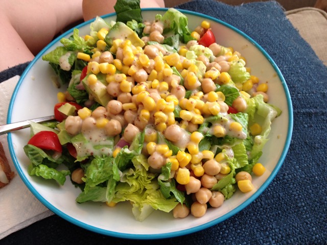 For lunch I had a huge salad with romaine, tomatoes, red onion. avocado, garbanzo beans, and corn. I drizzled it all with some honey mustard dressing.