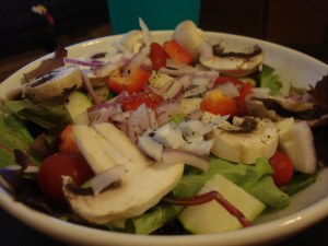 In the mix: Organic Mix from Costo, grape tomatoes, sliced mushrooms, cucumbers, red pepper, and red onion - fresh cracked pepper anyone?