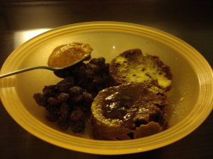 One of April’s protein muffins. I use Shaklee Creamy Cocoa protein powder. Mommasita (aka: Mom) tried this before and she made the funniest face. I guess my tastebuds are different than most. I love it! On the side, raisins and a spoonful of Smucker’s All Natural Chunky Peanutbutter.