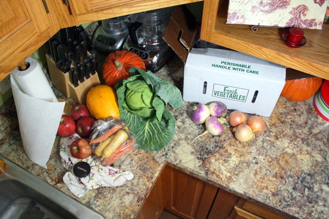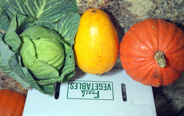 Cabbage, Spaghetti Squash, and Red Kuri Squash (which I have never had). The squash resembles a kabocha on the outside, so I am looking forward to seeing what it tastes like!