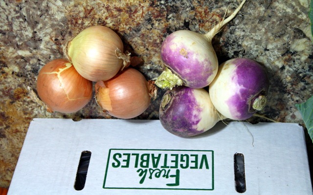 The last two items we received were three onions and three turnips, which our farm suggested roasting. I don’t know if I’ve ever roasted a turnip before!