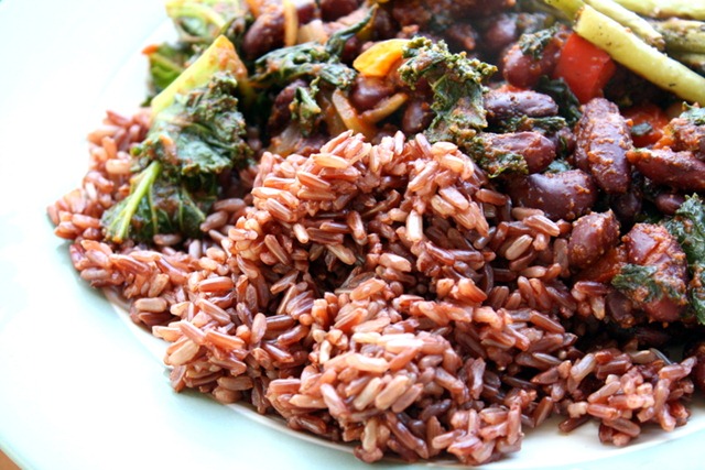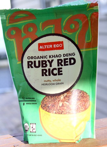 Dinner featured another new to me food — Ruby Red Rice which is very prevalent in Thailand. In fact, did you know the phrase “I’m hungry” in Thailand really translates to “I’m hungry for rice”? I learned this on the back of the package when I was reading the directions on how to cook it. This is another product Alter Eco sent to me, and I was excited to try it out.