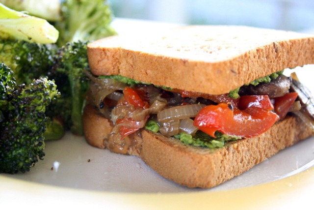 Thursday: Mushroom and Pesto Paninis and Roasted Broccoli (loosely based off of Katie’s Portobello Pesto Paninis)