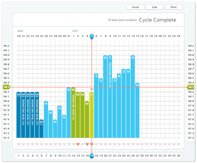 Last year I went to my regular gyno to talk about it and she wanted to put me on Provera which is a progesterone challenge - I didn’t want to take any hormones because it wouldn’t be “fixing” the problem. She saw differently, so she referred me to an infertility clinic in my area to get additional testing done. For the temperatures, the are higher after you ovulate, so the lower times are when babymaking could possibly occur. It’s in the few days before temps get higher that you’re most fertile.